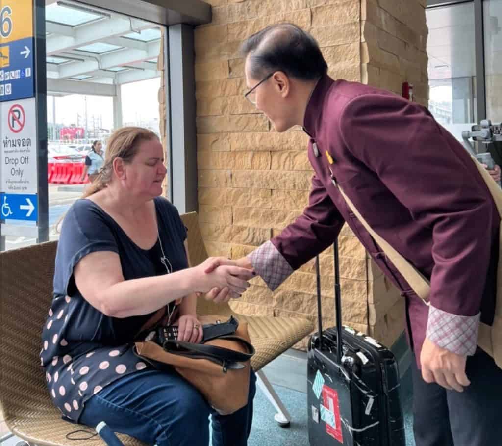 เราจึงขอรบกวนให้ทีมเจ้าหน้าที่ของ สำนักงานส่งเสริมการจัดประชุมและนิทรรศการ (สสปน. )ที่มาทำหน้าที่ฝ่ายต้อนรับคณะเดินทางของคนตาบอดจากนานาประเทศที่สนามบินภูเก็ต ให้ช่วยติดตามกระเป๋าของMiss Martine จากสายการบินสิงคโปร์แอร์ไลน์ให้