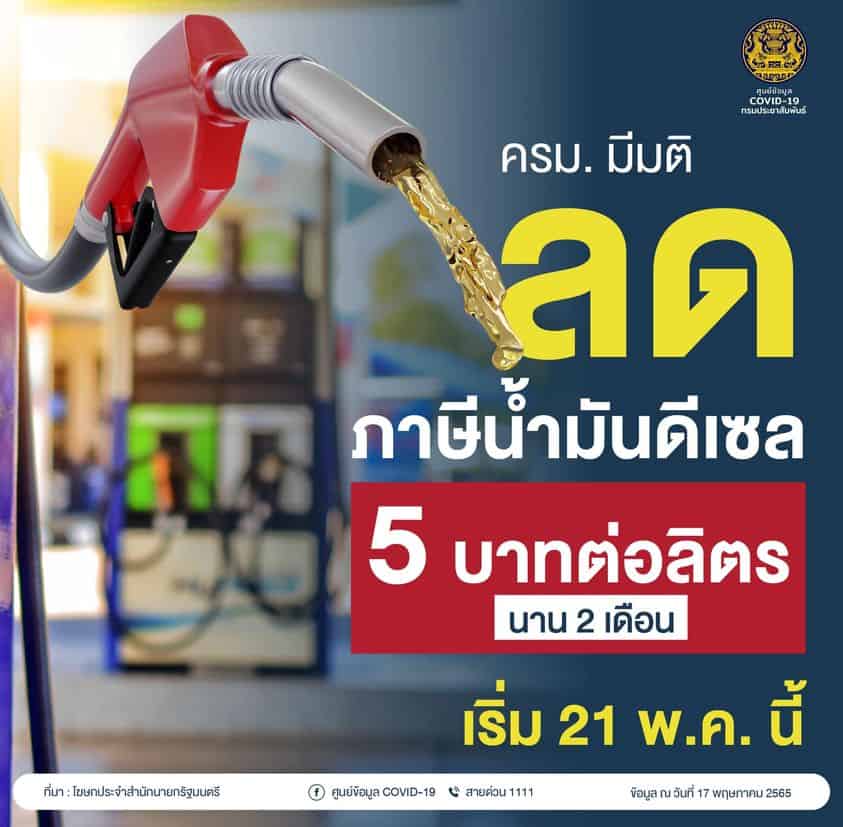 ครม.มีมติลดภาษีน้ำมันดีเซล 5 บาทต่อลิตร นาน 2 เดือน เริ่ม 21 พ.ค. นี้
