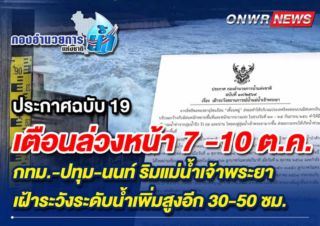 กอนช.เตือนล่วงหน้า 7-10 ต.ค. กทม.-ปทุม-นนท์ ริมแม่น้ำเจ้าพระยา เฝ้าระวังระดับน้ำเพิ่มสูงอีก 30-50 ซม.