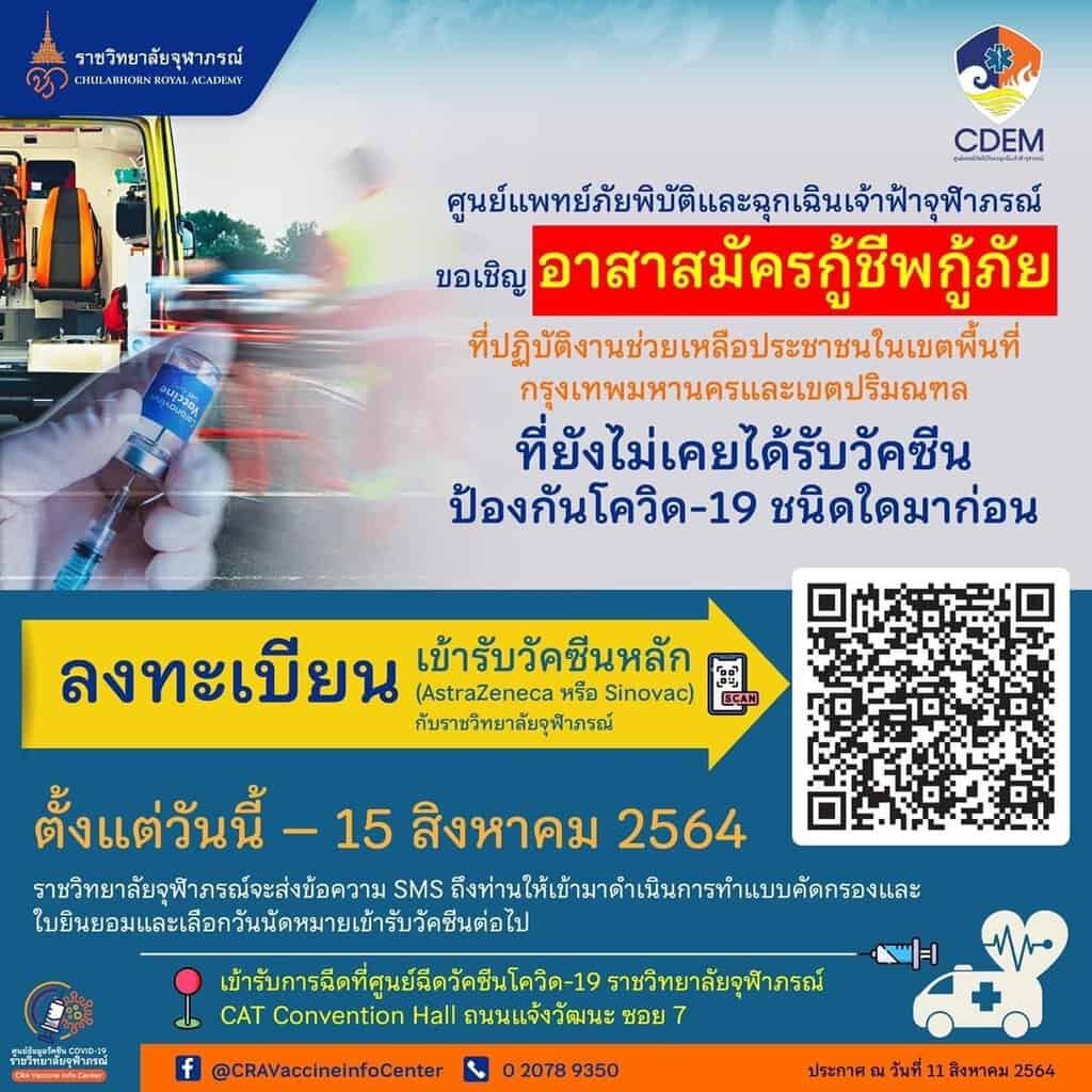 ราชวิทยาลัยจุฬาภรณ์เปิดลงทะเบียนฉีดวัคซีนโควิด-19 ให้อาสาสมัครกู้ชีพกู้ภัยในพื้นที่กทม.และปริมณฑลวันนี้ถึง 15 สิงหาคม