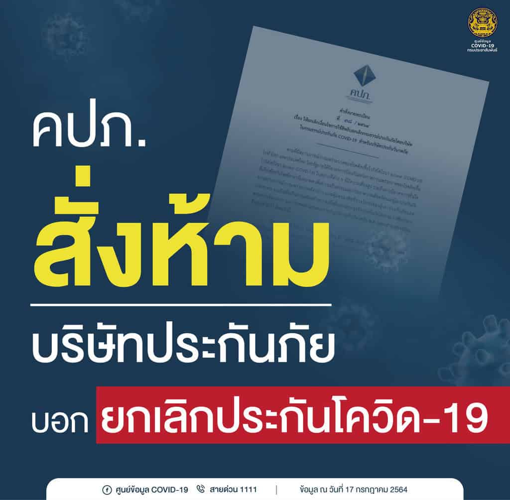 คปภ. ออกคำสั่งนายทะเบียน ห้ามบริษัทประกันภัย บอกเลิกกรมธรรม์ ประกันภัย COVID-19 เพื่อคุ้มครองสิทธิประโยชน์ของประชาชน