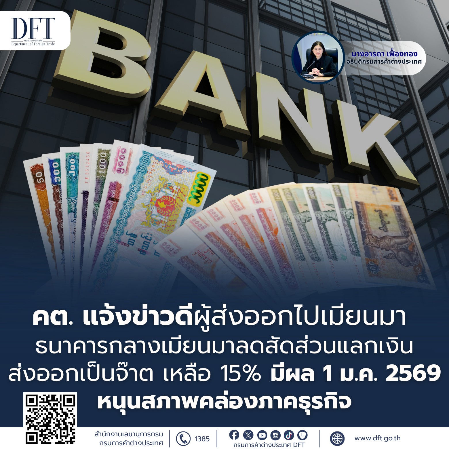 “พาณิชย์”แจ้งข่าวดีส่งออกเมียนมา แบงก์ชาติเมียนมาลดแลกเงินเป็นจ๊าตเหลือ 15% เหลือ 15% มีผล 1 ม.ค. 2569 หนุนสภาพคล่องภาคธุรกิจ