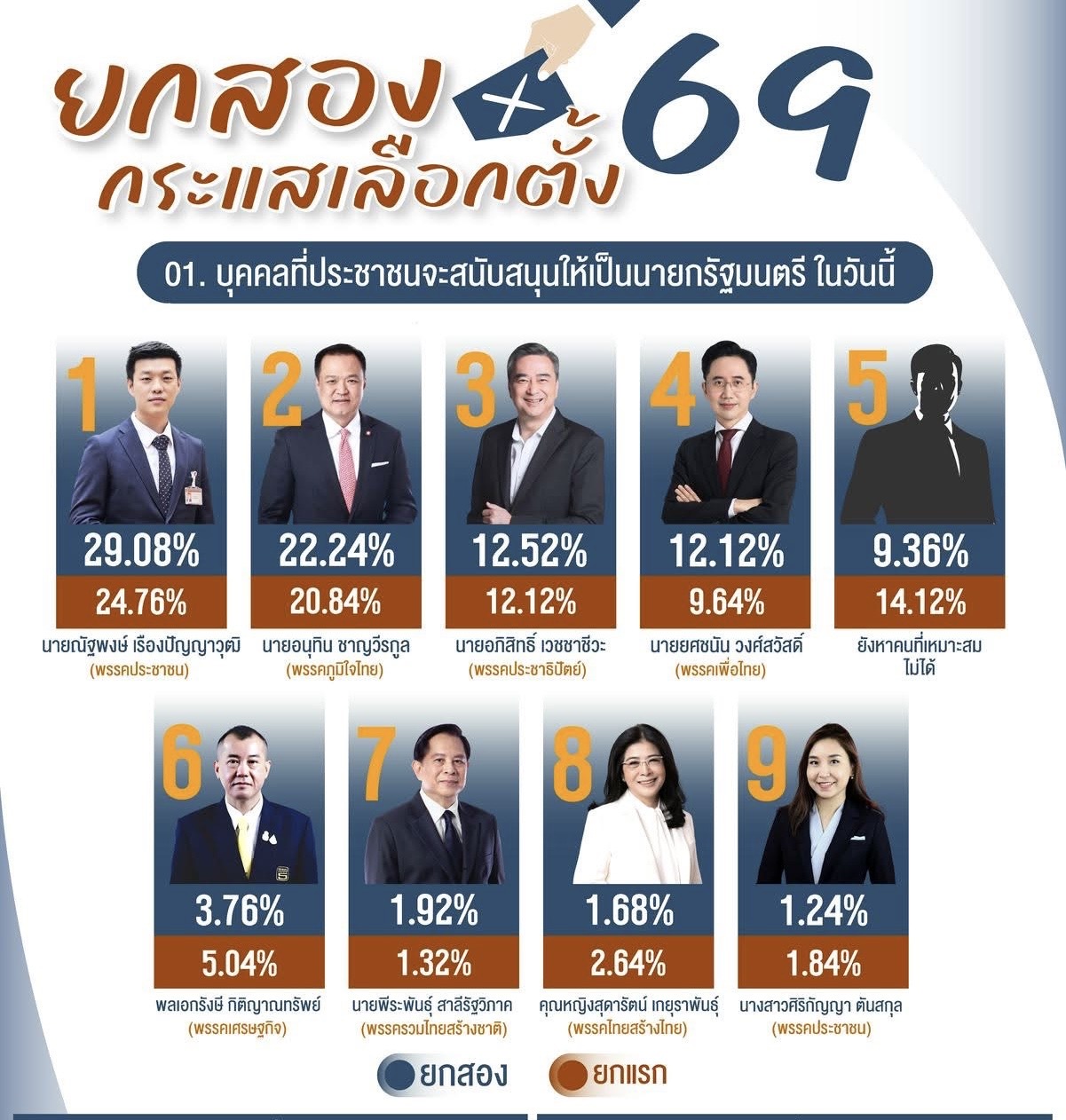 “ยกสอง กระแสเลือกตั้ง 69”พรรคประชาชนยังได้รับคะแนนนิยมสูงสุดทั้งสส.และเท้ง แคดิเดตนายกฯ