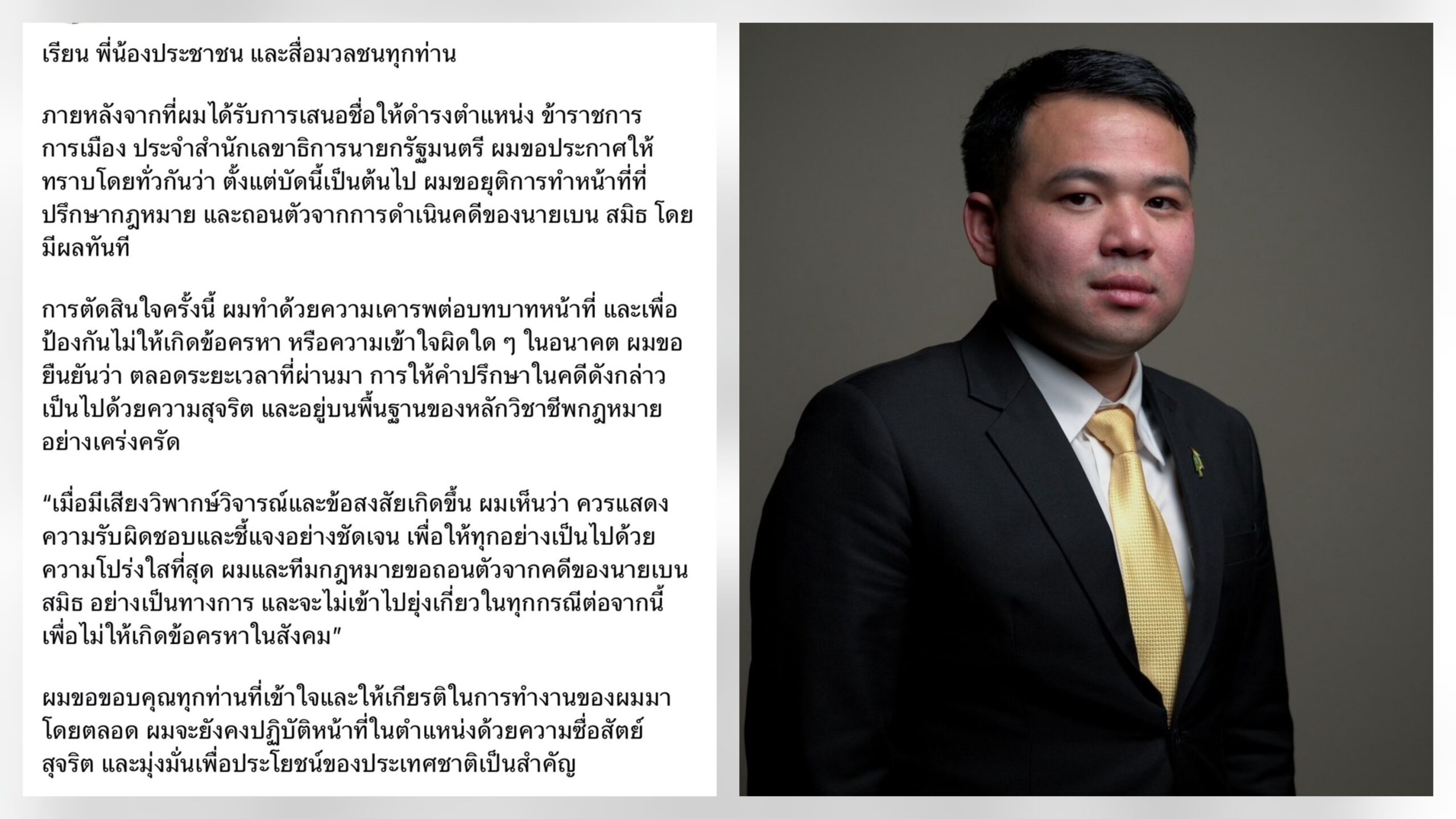 “ธนดล”ประกาศถอนตัวไม่ยุ่งเกี่ยวคดี “เบน สมิธ” ย้ำ อยากให้ทุกอย่างโปร่งใส ไร้ข้อครหา