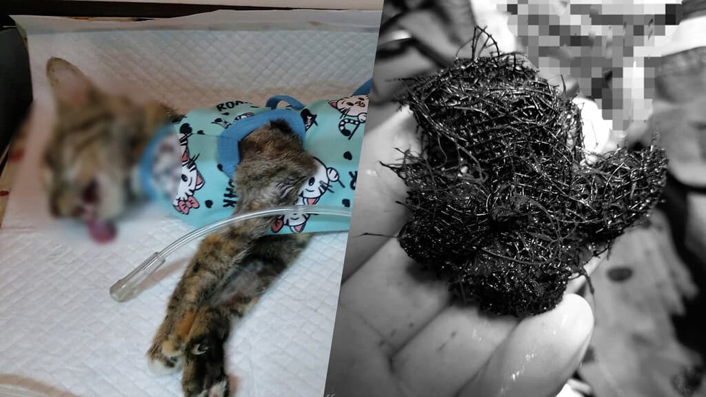 แมวไม่กิน-ไม่ถ่าย หมออึ้งเอกซเรย์เจอก้อนอุดตันในกระเพาะ ที่แท้คือมุ้งลวด