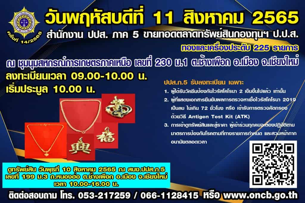 สำนักงาน ปปส. ภาค 5 โดยกองทุนป้องกัน ปราบปราม และแก้ไขปัญหายาเสพติด มีความประสงค์จะขายทอดตลาดทรัพย์สินกองทุนฯ ป.ป.ส. ครั้งที่ 14/2565 ประเภททองและเครื่องประดับ จำนวน 225 รายการ โดยจะทำการขายทอดตลาด ในวันพฤหัสบดีที่ 11 สิงหาคม 2565 ตั้งแต่เวลา 10.00 น. เป็นต้นไป ณ ชุมนุมสหกรณ์การเกษตรภาคเหนือ เลขที่ 230 หมู่ที่ 1 ตำบลช้างเผือก อำเภอเมือง จังหวัดเชียงใหม่ ผู้ที่สนใจดูรายละเอียด รูปภาพ และเงื่อนไข ได้ที่ https://citly.me/FuLar