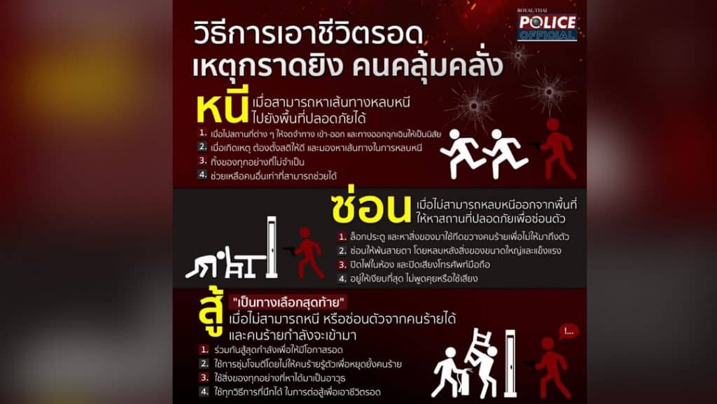 สำนักงานตำรวจแห่งชาติ เผยแพร่คู่มือ “หนี ซ่อน สู้” วิธีการเอาตัวรอดฉบับสากล หากตกอยู่ในสถานการณ์เหตุกราดยิง หรือคนคลุ้มคลั่ง