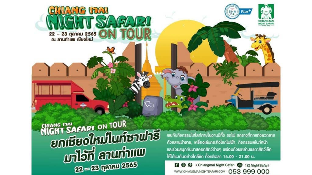 เชียงใหม่ไนท์ซาฟารี จัดกิจกรรมส่งเสริมการท่องเที่ยว และต้อนรับนักท่องเที่ยวในช่วงไฮซีซันที่กำลังจะมาถึง พร้อมเชิญชวนเที่ยว “Chiang Mai Night Safari ON TOUR ยกเชียงใหม่ไนท์ซาฟารี มาไว้ที่ ลานท่าแพ” ในวันที่ 22 – 23 ตุลาคม 2565 ตั้งแต่เวลา 16.00 – 21.00 น. เข้าชมและร่วมสนุกกับกิจกรรมต่างๆ ฟรีตลอดงาน ไม่มีค่าใช้จ่าย