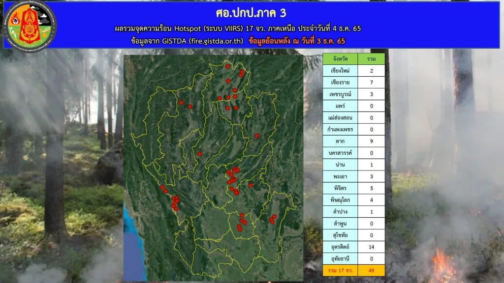สภาพอากาศแห้งจุดความร้อนเริ่มเพิ่มขึ้น ศอ.ปกป.ภาค 3 รายงาน พื้นที่ 17 จังหวัดภาคเหนือพบจุดความร้อน 49 จุด มากที่สุดอุตรดิตถ์ 14 จุด ตาก 9 จุด เชียงราย 7 จุด เชียงใหม่พบ 2 จุด