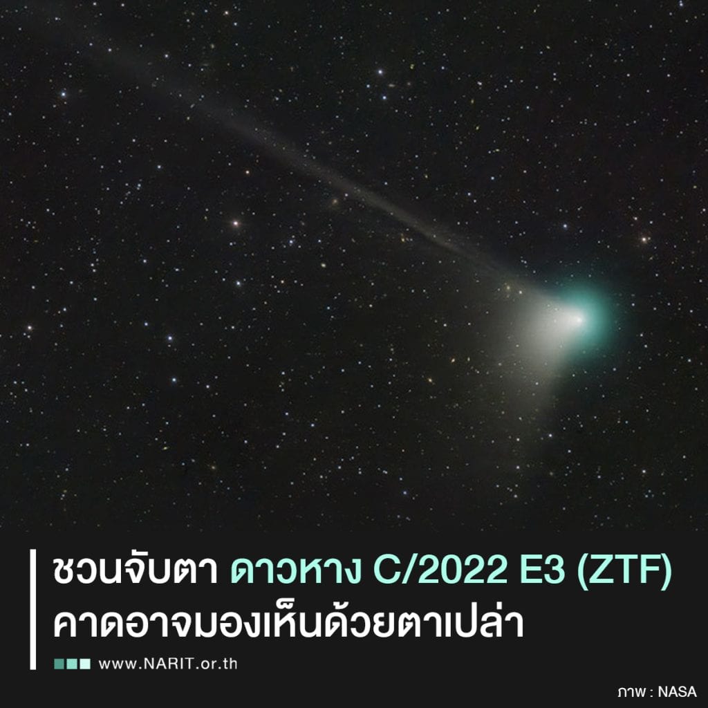 สถาบันวิจัยดาราศาสตร์แห่งชาติ (องค์การมหาชน) (สดร.) กระทรวงการอุดมศึกษา วิทยาศาสตร์ วิจัย และนวัตกรรม (อว.) ชวนจับตาดาวหาง C/2022 E3 (ZTF) (ซีสองศูนย์สองสอง อีสาม แซดทีเอฟ) ตั้งแต่ช่วงนี้จนถึงต้นเดือนกุมภาพันธ์ 2566 ในช่วงรุ่งเช้า ทางทิศตะวันออก ก่อนดวงอาทิตย์ขึ้น ลุ้นชมด้วยตาเปล่าในคืนไร้แสงจันทร์รบกวน บริเวณพื้นที่มืดสนิท แนะนำชมผ่านกล้องโทรทรรศน์ หรือกล้องสองตา จะเห็นชัดเจนยิ่งขึ้น