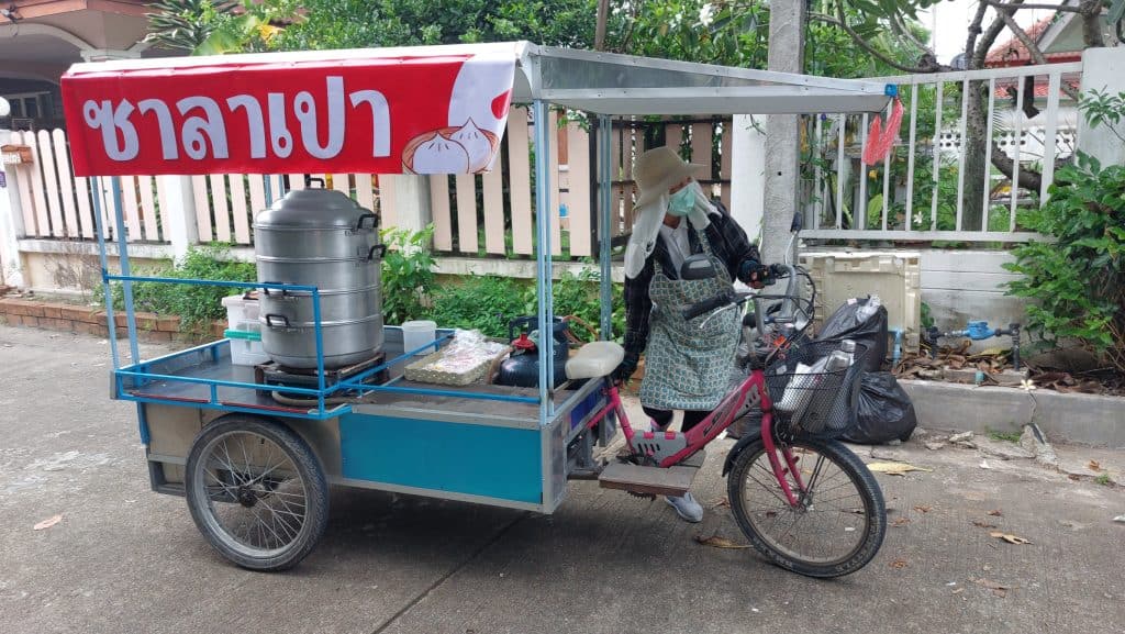 วันนี้ผู้สื่อข่าวพาไปชิม ซาลาเปา เร่ขายแถวตำบลสันปูเลย อำเภอดอยสะเก็ด จังหวัดเชียงใหม่ ที่บอกได้เลยว่าอร่อยมาก แป้งนุ่ม ไส้หมู มีหน่อไม้ เห็ดหอม ไข่เค็ม ไส้ครีม และไส้ถั่วดำ ลูกละ 10 บาท ออกเร่ขายชั่วบ่ายโมงเพียง 3 โมงครึ่ง ถึง 4 โมงหมดเกลี้ยง นางจันทร์ อินทวงศ์ อายุ 52 ปี เช่าบ้านอยู่ บ้านสันต้นดู่ ตำบลสันปู่เลย อำเภอดอยสะเก็ด จังหวัดเชียงใหม่ บอกว่าซาลาเปาของตนนั้นเป้นสูตรดั่งเดิมของอากงอาม้า สามีอยู่จังหวัดเชียงราย เป็นชาวจีนแต้จิ๋ว มาทำเร่ขายอยู่ในละแวกนี้ ทำขายมาได้ปีกว่า ก็ใช้รถจักรยานดันแปลงเป็นรถไฟฟ้า สามีทำเองต่อเอง ต้นทุนทั้งหมดกว่า 1 หมื่นกว่าบาท แพงตรงที่มอเตอร์รถ ใช้ได้นานวิ่งหลายกิโลเมตร ตอนนี้จากเงินขายซาลาเปาได้ทุนคืนหมดแล้ว ขายตอนนี้เป็นกำไร ล้วนๆ มีรายได้วันละ 300 -400 บาท หักต้นทุนในแต่ละวันแล้ว กำไรมากน้อยขึ้นอยู่ว่าราคาวัตถุดิบที่ถูกจะแพง ยิ่งช่วงนี้วัตถุดิบแพงขึ้น ตอนนี้ยอมรับปัญหาต้นทุนจากวัตถุดิบแพงขึ้นทุกวัน ก็ยังไม่รู้ว่าจะทำขายต่อได้หรือไม่ ไม่ได้ลดปริมาณขนาดซาลาเปายังเท่าเดิม คงเดิม ส่วนะจะปรับราคาขึ้นก็สงสารลูกค้า หากแพงขึ้นไปกว่านี้คงต้องหยุดขายก่อน