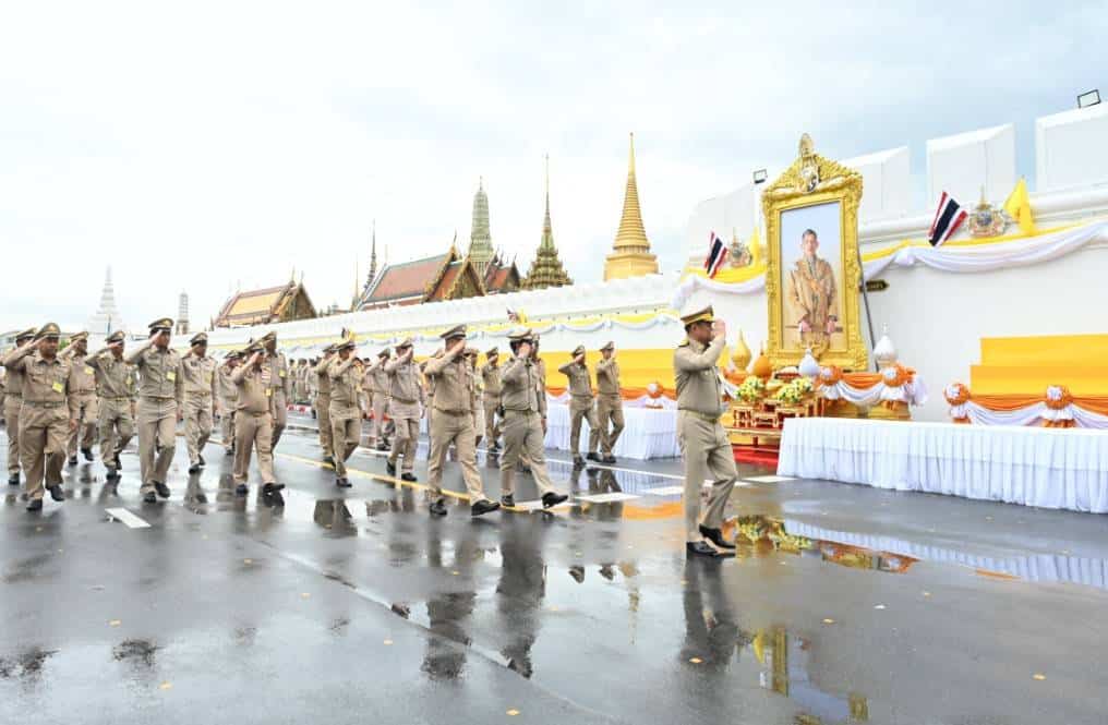 ตอนที่ 7 วงดุริยางค์กองทัพอากาศ ตอนที่ 8 ข้าราชการและพนักงานรัฐวิสาหกิจในสังกัดกระทรวงมหาดไทย และตอนที่ 9 รถตำรวจปิดขบวน รวมจำนวนผู้ร่วมขบวน 1,072 คน ความยาวขบวน 168 เมตร ทำการเคลื่อนขบวนฯ ไปตามถนนสนามไชย เลี้ยวซ้ายเข้าถนนหน้าพระลาน ถึงหน้าประตูวิเศษไชยศรี โดยมีผู้แทนนายกรัฐมนตรี ผู้แทนประธานรัฐสภา ผู้แทนประธานศาลฎีกา เชิญพระเต้าปทุมนิมิตทอง นาก เงิน และพานดอกไม้รูปเทียนแพ และผู้บริหารกระทรวงมหาดไทย เข้าประตูวิเศษไชยศรี ผ่านประตูพิมานไชยศรี ไปยังพระที่นั่งอมรินทรวินิจฉัย ผ่านพระทวารกลาง ไปยังหน้าพระวิสูตร จากนั้น ผู้แทนนายกรัฐมนตรี ผู้แทนประธานรัฐสภา ผู้แทนประธานศาลฎีกา เชิญพระเต้าปทุมนิมิตทอง นาก เงิน มอบให้เจ้าพนักงานภูษามาลา สำนักพระราชวัง เพื่อเชิญไปวางบนพระแท่นบัว หน้าพระวิสูตร ผู้แทนนายกรัฐมนตรี ผู้แทนประธานรัฐสภา ผู้แทนประธานศาลฎีกา เชิญพานดอกไม้ ธูปเทียนแพไปวางที่เสาบัวกลุ่ม ตามลำดับ จากนั้น ผู้ว่าราชการจังหวัดทุกจังหวัด และผู้ว่าราชการกรุงเทพมหานคร ฝึกซ้อมการถวายราชสักการะหน้าพระบรมฉายาลักษณ์พระบาทสมเด็จพระเจ้าอยู่หัว เป็นอันเสร็จขั้นตอนการฝึกซ้อม ซึ่งเป็นไปด้วยความเรียบร้อย และเป็นการดำเนินการตามแนวปฏิบัติและขั้นตอนตามโบราณราชประเพณี .