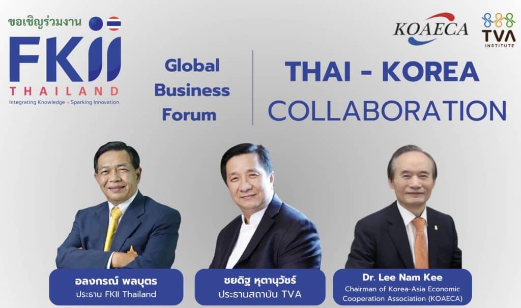 วันนี้ 5 ก.ย.67 นายอลงกรณ์ พลบุตร ประธานสถาบันเอฟเคไอไอ. ไทยแลนด์ (FKII Thailand: Field for Knowledge Integration and Innovation) เปิดเผยวันนี้ว่า สถาบันเอฟเคไอไอ. ไทยแลนด์(FKII Thailand) สถาบันทิวา(TVA)และสมาคมความร่วมมือทางเศรษฐกิจเกาหลี-เอเซีย(Korea-Asia Economic Cooperation Association :KOAECA)จับมือจัดงานสัมมนา(seminar)และจับคู่ธุรกิจ(business matching) “เอฟเคไอไอ. โกลบอล บิสสิเนส ฟอรั่ม : ความร่วมมือ ไทย-เกาหลี” (FKII GLOBAL BUSINESS FORUM: THAI – KOREA COLLABORATION) ในวันศุกร์ที่ 6 กันยายน 2567 เวลา 9.00-13.30 น. ณ สวนเสียงไผ่ ทาวน์อินทาวน์