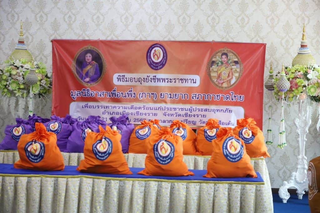 มูลนิธิอาสาเพื่อนพึ่ง (ภาฯ) ยามยาก สภากาชาดไทย โดยมีพระเจ้าวรวงศ์เธอ พระองค์เจ้าโสมสวลี กรมหมื่นสุทธนารีนาถ ดำรงตำแหน่ง องค์นายกกิตติมศักดิ์ตลอดชีพ และสมเด็จพระเจ้าลูกเธอ เจ้าฟ้าพัชรกิติยาภา นเรนทิราเทพยวดี กรมหลวงราชสาริณีสิริพัชร มหาวัชรราชธิดา ดำรงตำแหน่ง องค์ประธานกรรมการมูลนิธิฯ เชิญถุงยังชีพพระราชทานมอบให้แก่ประชาชนผู้ประสบอุทกภัยในพื้นที่จังหวัดเชียงราย โดยมี ผู้ว่าราชการจังหวัดเชียงราย เป็นประธานในพิธี พร้อมด้วย หัวหน้าส่วนราชการ ผู้บริหารท้องถิ่น กำนัน ผู้ใหญ่บ้าน และเจ้าหน้าที่มูลนิธิฯ เข้าร่วมในพิธี เชิญถุงยังชีพพระราชทานถวายแด่พระภิกษุสงฆ์ จำนวน 105 รูป และมอบถุงยังชีพพระราชทานให้แก่ประชาชนในพื้นที่อำเภอเมือง จำนวน 3,500 ถุง เพื่อบรรเทาความเดือดร้อนและเป็นขวัญกำลังใจให้กับประชาชน