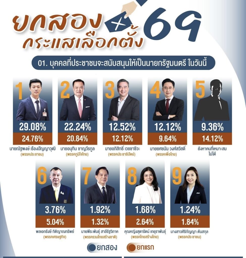 ศูนย์สำรวจความคิดเห็น “นิด้าโพล” สถาบันบัณฑิตพัฒนบริหารศาสตร์ (นิด้า) สำรวจความคิดเห็น เรื่อง “ยกสอง กระแสเลือกตั้ง 69” ระหว่างวันที่ 23-27 ม.ค. 2569 จากประชาชนที่มีอายุ 18 ปีขึ้นไป กระจายทุกภูมิภาค ระดับการศึกษา อาชีพ และรายได้ ทั่วประเทศ 2,500 หน่วยตัวอย่าง เกี่ยวกับกระแสการเลือกตั้ง ปี 2569