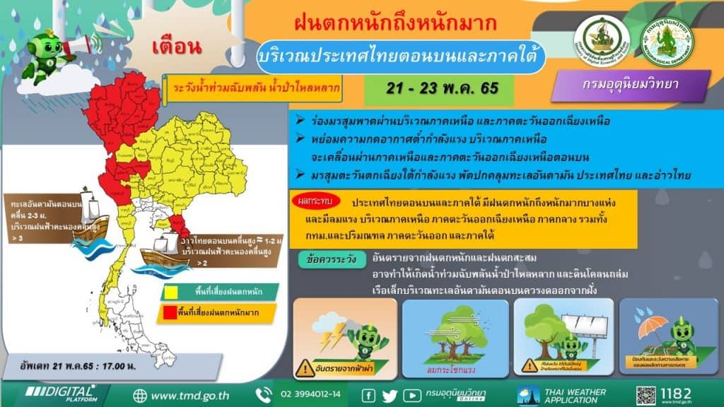ประกาศกรมอุตุนิยมวิทยา”ฝนตกหนักถึงหนักมากบริเวณประเทศไทยตอนบนและภาคใต้ (มีผลกระทบถึงวันที่ 23 พฤษภาคม 2565)” ฉบับที่ 7 ลงวันที่ 21 พฤษภาคม 2565 หย่อมความกดอากาศต่ำกำลังแรงปกคลุมภาคเหนือของประเทศไทย ประกอบกับมีร่องมรสุมพาดผ่านภาคเหนือ และภาคตะวันออกเฉียงเหนือ ในขณะที่มรสุมตะวันตกเฉียงใต้กำลังค่อนข้างแรงพัดปกคลุมประเทศไทย ทะเลอันดามัน และอ่าวไทย ลักษณะเช่นนี้ทำให้ประเทศไทยตอนบนมีฝนฟ้าคะนองกับมีลมแรง และมีฝนตกหนักถึงหนักมากบางพื้นที่ในบริเวณภาคเหนือ ภาคตะวันออกเฉียงเหนือ ภาคกลาง ภาคตะวันออก รวมทั้งภาคใต้ตอนบน ขอให้ประชาชนระวังอันตรายจากฝนตกหนักถึงหนักมาก และฝนที่ตกสะสมซึ่งอาจทำให้เกิดน้ำท่วมฉับพลันและน้ำป่าไหลหลาก และเพิ่มความระมัดระวังในการสัญจรผ่านบริเวณที่มีฝนฟ้าคะนอง สำหรับเกษตรกรควรเตรียมการป้องกันและระวังความเสียหายที่จะเกิดต่อผลผลิตทางการเกษตรไว้ด้วย