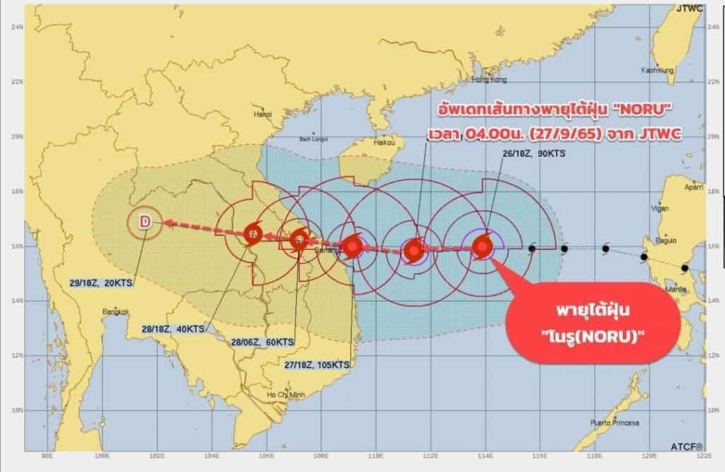 กรมอุตุนิยมวิทยารายงานเส้นทางพายุ”โนรู (NORU)” เช้าวันนี้ (27/9/65) : พายุไต้ฝุ่น “โนรู(NORU)” บริเวณทะเลจีนใต้ตอนกลาง คาดว่าจะเคลื่อนขึ้นฝั่งประเทศเวียดนามตอนกลาง (เมืองดานัง) ในช่วงเช้าของวันที่ 28 กันยายน 2565 และจะอ่อนกำลังลงเป็นพายุโซนร้อน เคลื่อนผ่าน สปป.ลาว และเข้าสู่ด้านตะวันออกของภาคอีสาน บริเวณตอนบนของ จ.อุบลราชธานี และ จ.อำนาจเจริญ ช่วงเย็นของวันที่ 29 ก.ย.65 และจะอ่อนกำลังลงเป็นพายุดีเปรสชัน และหย่อมความกดอากาศต่ำตามลำดับ จากนั้นจะเคลื่อนเข้าปกคลุมภาคอีสานตอนกลาง ภาคกลาง และภาคเหนือต่อไป ซึ่งอาจทำให้มีฝนตกหนักถึงหนักมากบริเวณภาคอีสานตอนล่าง บริเวณ จ.อุบลราชธานี ศรีสะเกษ สุรินทร์ บุรีรัมย์ ต้องเฝ้าระวังและติดตามประกาศจากกรมอุตุนิยมวิทยาอย่างใกล้ชิด (ข้อมูลนี้อาจมีการเปลี่ยนแปลงได้ ตามข้อมูลนำเข้าใหม่)