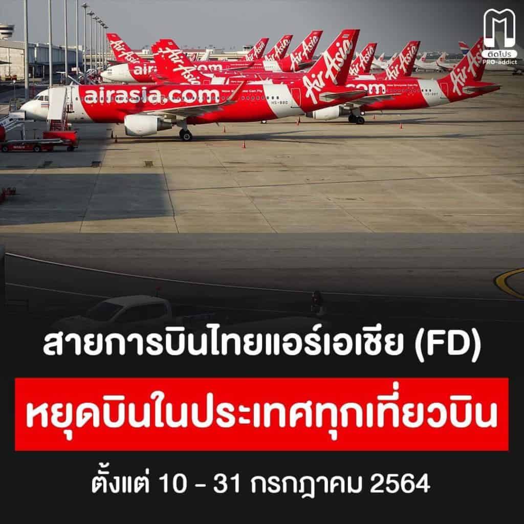 ก่อนหน้านี้สายการบินไทยแอร์เอเชีย แจ้งว่า เพื่อให้ความร่วมมือกับมาตรการรัฐ ในการป้องกันการแพร่ระบาดของ COVID-19 ตามมาตรการของศูนย์บริหารโควิด-19(ศบค.) ไทยแอร์เอเชีย (เที่ยวบินรหัส FD) มีความจำเป็นต้องระงับการให้บริการเส้นทางบินภายในประเทศชั่วคราวตั้งแต่วันที่ 10 ก.ค. -31 ก.ค. 2564 นี้