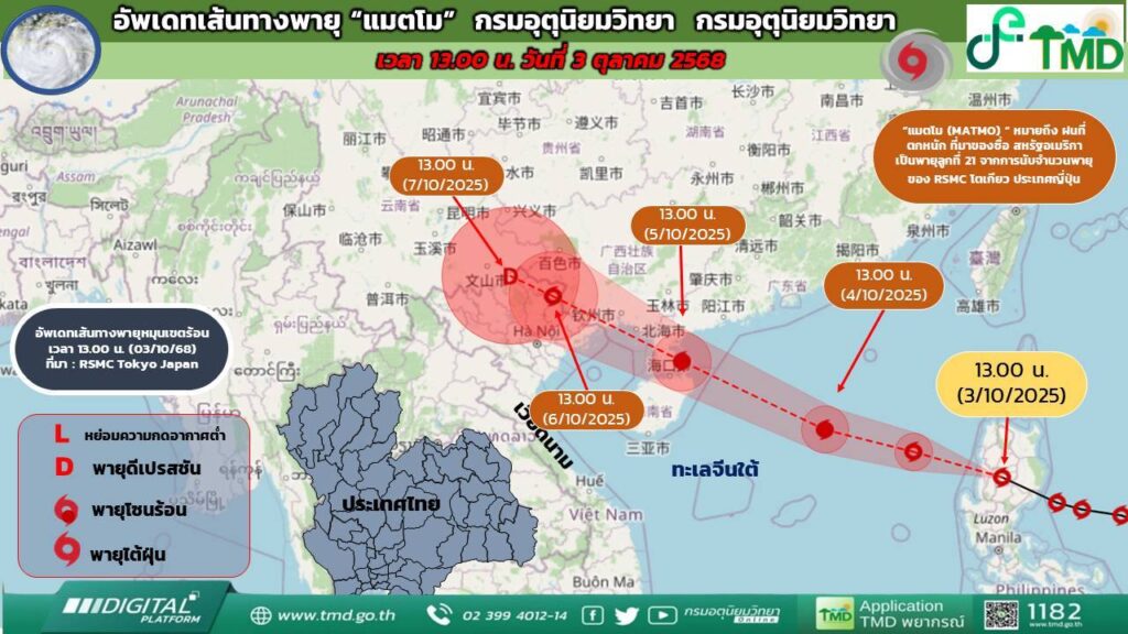 เมื่อเวลา 16.00 น. ของวันนี้ (3 ต.ค. 68) พายุโซนร้อนกำลังแรง “แมตโม” บริเวณเกาะลูซอน ประเทศฟิลิปปินส์ ได้เคลื่อนลงสู่ทะเลจีนใต้แล้ว โดยมีศูนย์กลางอยู่ที่ละติจูด 17.3 องศาเหนือ ลองจิจูด 120.2 องศาตะวันออก ความเร็วลมสูงสุดใกล้ศูนย์กลางประมาณ 95 กิโลเมตรต่อชั่วโมง กำลังเคลื่อนตัวทางทิศตะวันตกค่อนทางเหนือเล็กน้อย ด้วยความเร็วประมาณ 25 กิโลเมตรต่อชั่วโมง พายุนี้มีแนวโน้มจะทวีกำลังแรงขึ้นเป็นพายุไต้ฝุ่น และคาดว่าจะเคลื่อนผ่านเกาะไหหลำ ประเทศจีน ลงสู่อ่าวตังเกี๋ย และขึ้นฝั่งบริเวณประเทศเวียดนามตอนบนในช่วงวันที่ 5-6 ต.ค. หลังจากนั้นจะอ่อนกำลังลงอย่างรวดเร็วตามลำดับเนื่องจากมีมวลอากาศเย็นจากประเทศจีนแผ่เสริมลงมาปกคลุมในช่วงวันที่ 6–7 ต.ค. 68 โดยพายุนี้ไม่เคลื่อนเข้าสู่ประเทศไทย