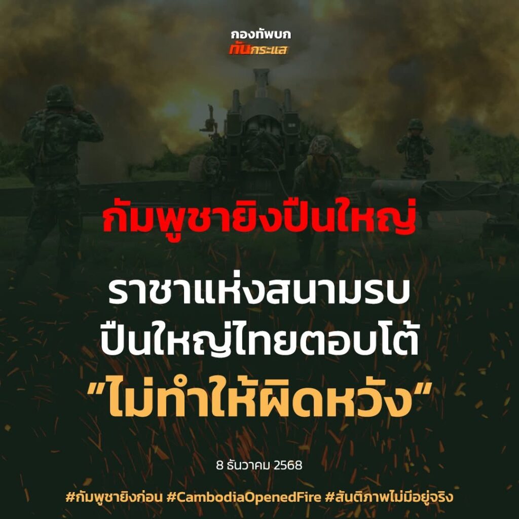 วันนี้เวลา 05.00 น. ศูนย์ปฏิบัติการกองทัพภาคที่ 2 ชี้แจงสถานการณ์ตามแนวชายแดนไทย–กัมพูชา ตามที่ฝ่ายกัมพูชาได้เปิดฉากยิงใส่ฝ่ายไทย