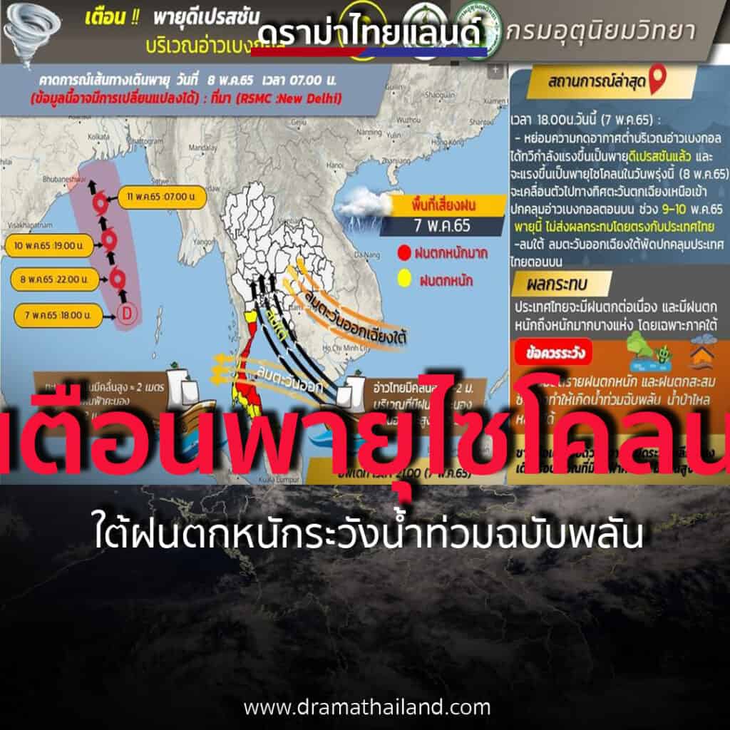 เมื่อเวลา 18.00 น. ของวันนี้(วันที่ 7 พ.ค. 2565) และเมื่อเวลา 22.00 น. พายุนี้มีจุดศูนย์กลางอยู่ที่ละติจูด 10.5 องศาเหนือ ลองจิจูด 90.0 องศาตะวันออก กำลังเคลื่อนตัวไปทางทิศตะวันตกเฉียงเหนือด้วยความเร็วประมาณ 15 กิโลเมตรต่อชั่วโมง ความเร็วลมสูงสุดใกล้จุดศูนย์กลางประมาณ 55 กิโลเมตรต่อชั่วโมง คาดว่าจะทวีกำลังแรงขึ้นเป็นพายุไซโคลนในวันพรุ่งนี้ (8 พ.ค. 65) มีแนวโน้มจะเคลื่อนตัวขึ้นไปปกคลุมอ่าวเบงกอลตอนบนในช่วงวันที่ 9-10 พ.ค. 65 พายุนี้จะไม่ส่งผลกระทบโดยตรงกับประเทศไทย แต่จะทำให้ลมตะวันออกเฉียงใต้ที่พัดปกคลุมประเทศไทย อ่าวไทย และทะเลอันดามัน มีกำลังปานกลาง ถึงค่อนข้างแรง ลักษณะเช่นนี้ทำให้ประเทศไทยยังคงมีฝนตกต่อเนื่องและมีฝนตกหนักบางแห่ง โดยมีฝนตกหนักมากในบริเวณภาคใต้ ขอให้ประชาชนบริเวณภาคใต้ระวังอันตรายจากฝนตกหนักและฝนตกสะสมซึ่งอาจทำให้เกิดน้ำท่วมฉับพลันและน้ำป่าไหลหลากได้